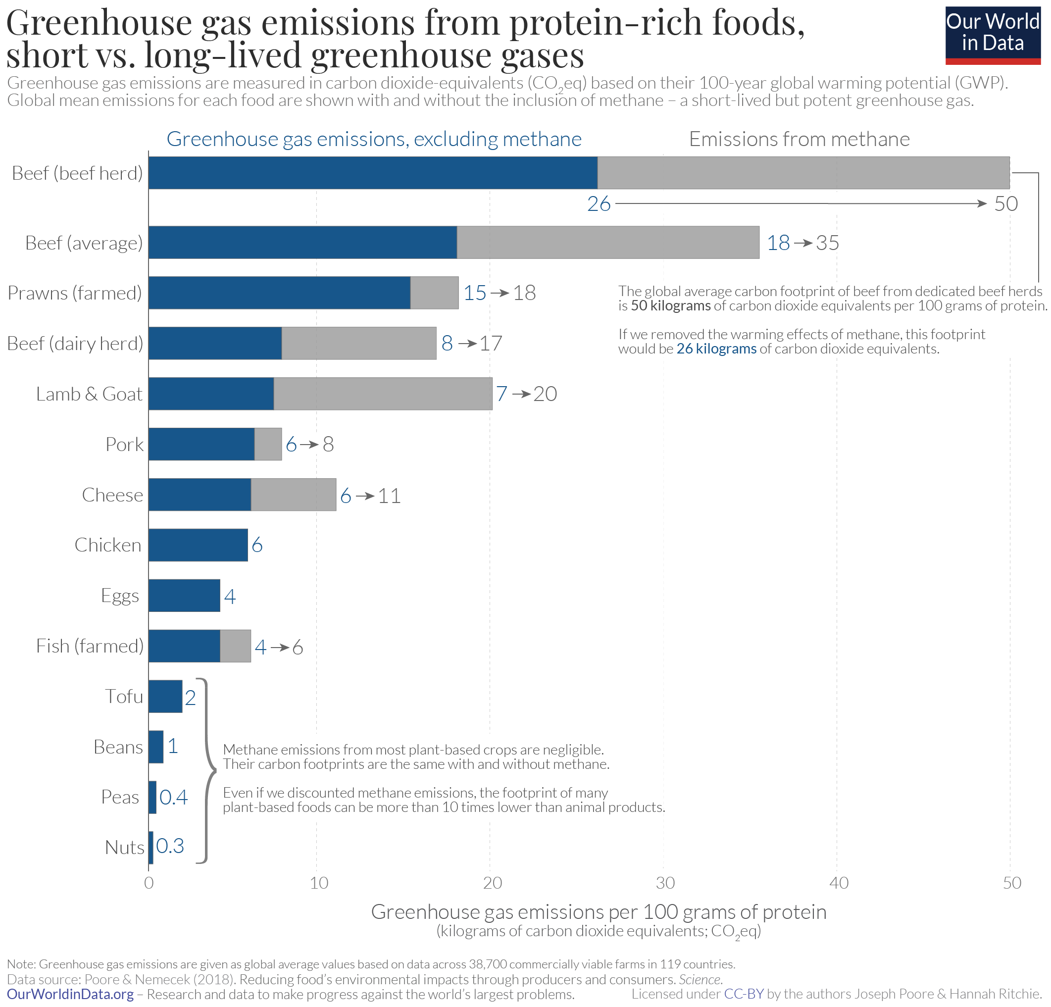 Chart showing how beef is by far the food product responsible for the most greenhouse gas emissions. Source: OurWorldInData.org