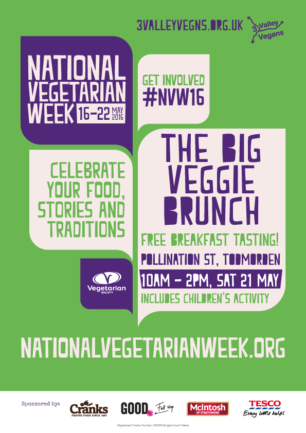 In our biggest event yet, 3 Valley Vegans is part of National Vegetarian Week 2016! The theme is “Celebrate your food, stories and traditions”. With the help of Incredible Edible Todmorden, we are doing this by hosting a free community brunch at Pollination Street, the community green space next to Todmorden market.